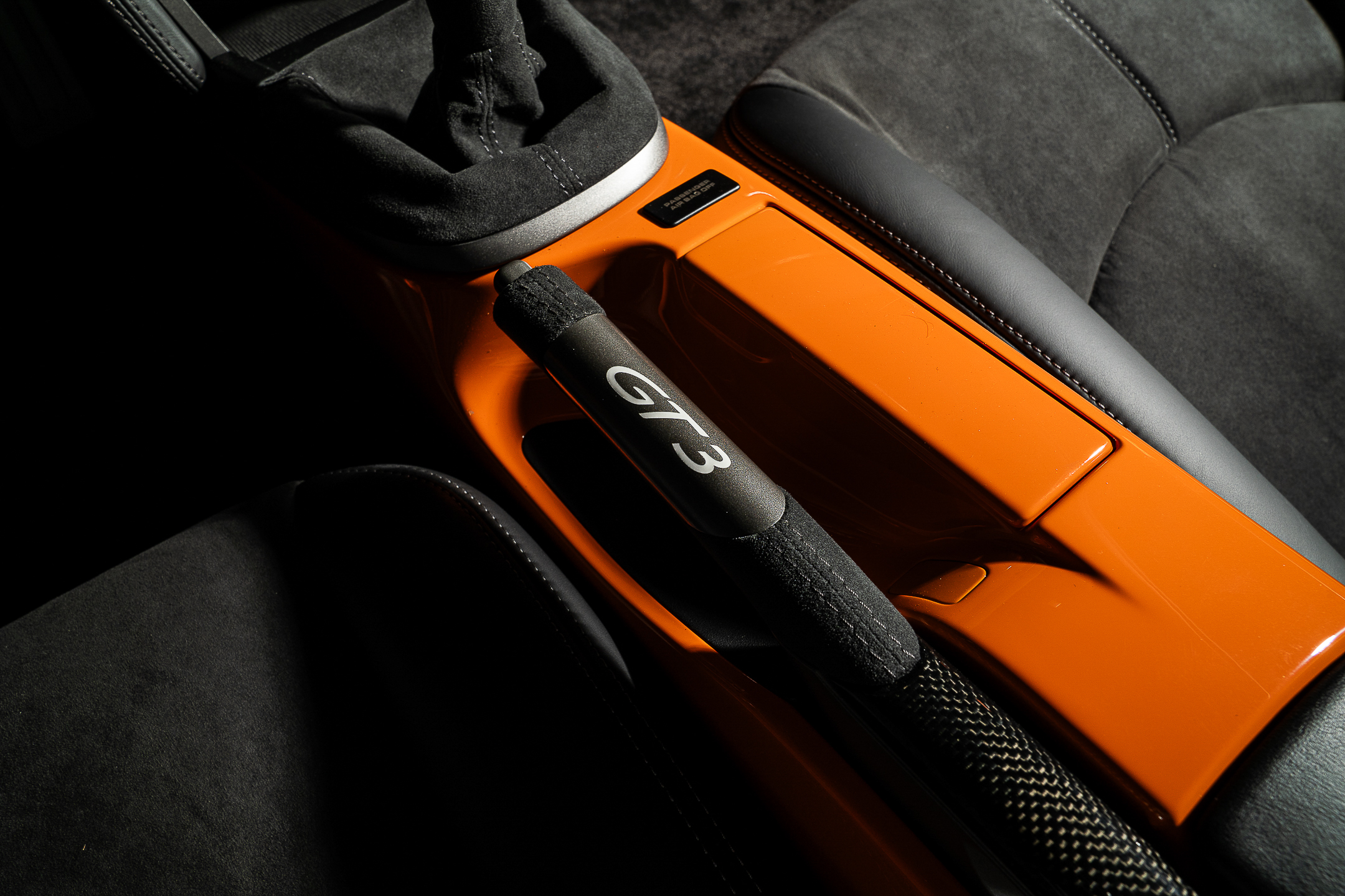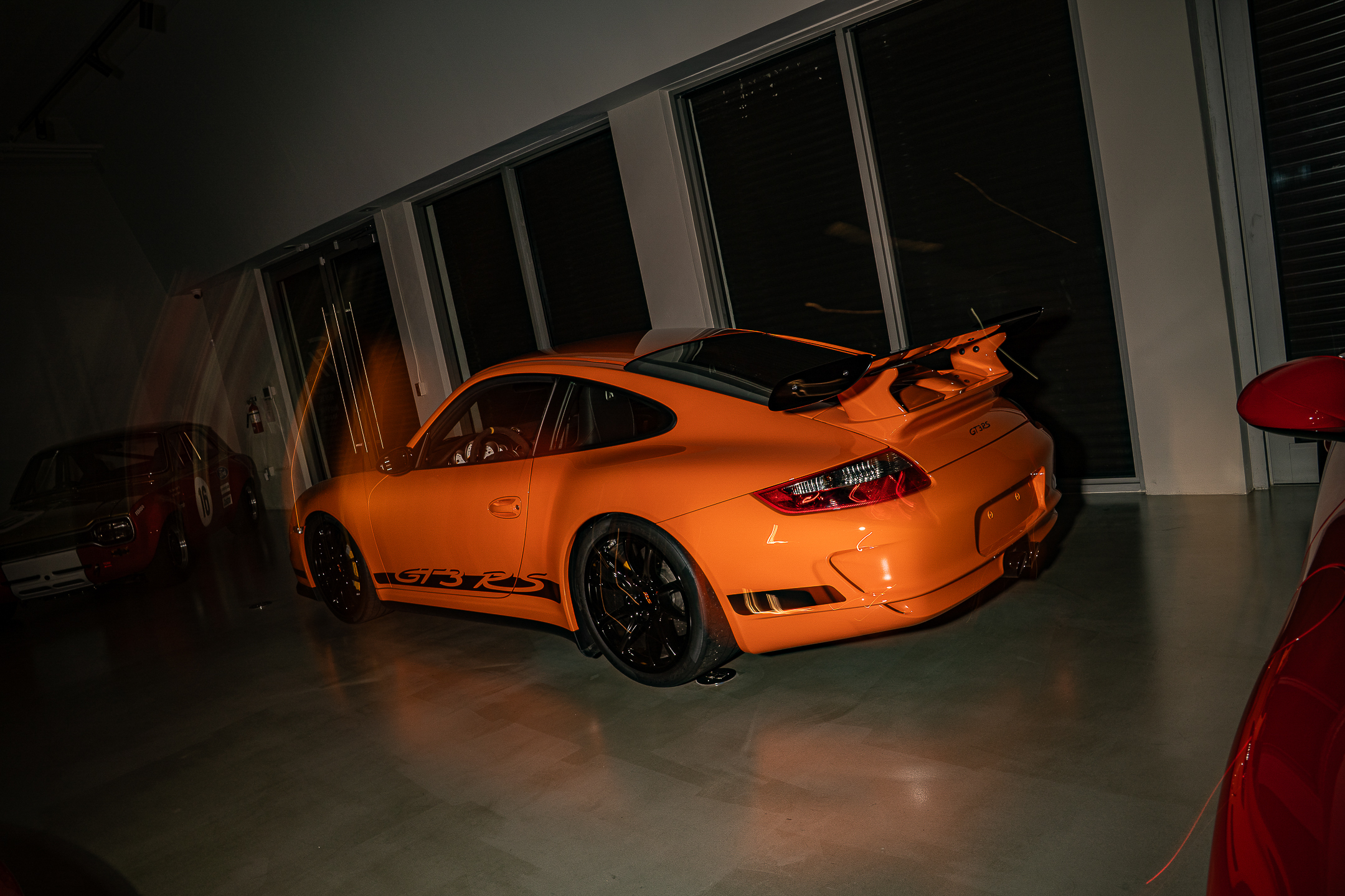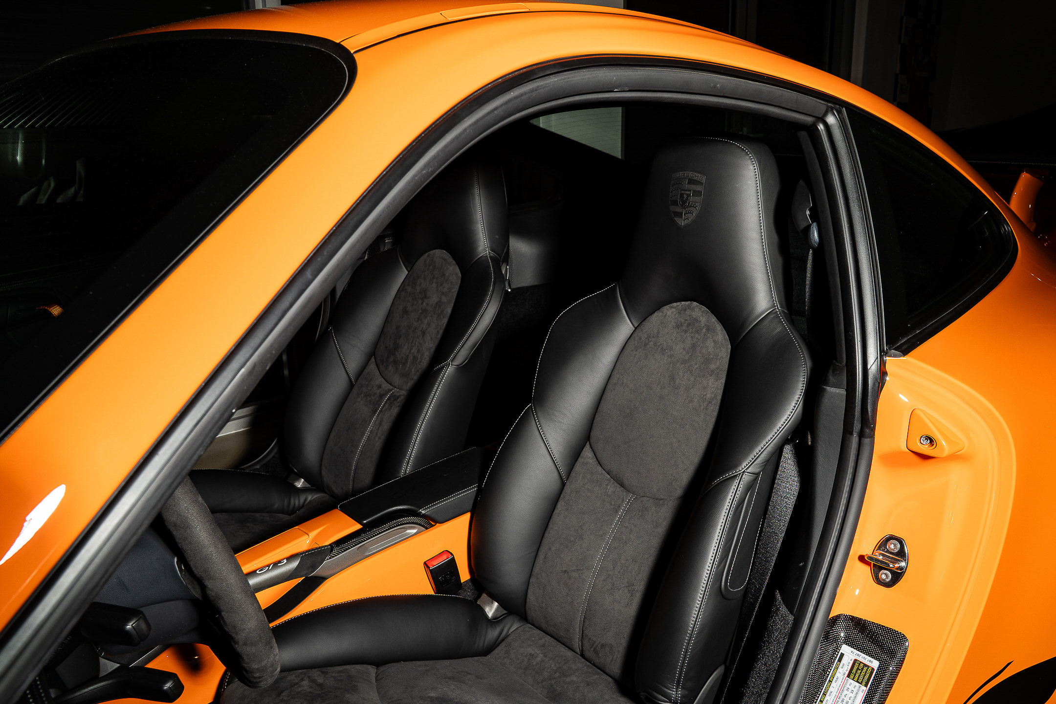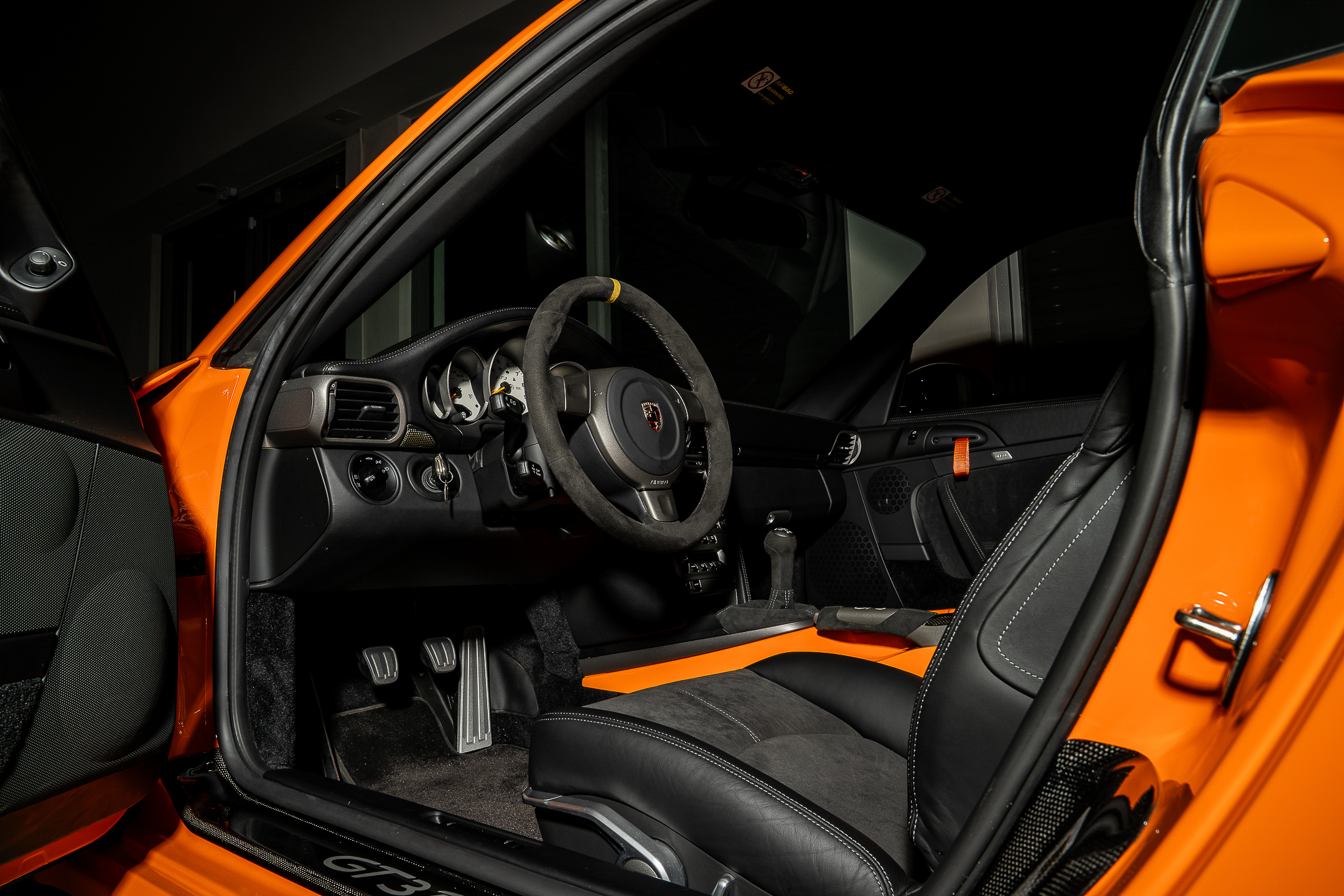 This example of GT3RS spec is known as the Pumpkin. Originally launched to the press in this striking Orange with black script livery, the 997 GT3RS came to the world in Orange, Black, White, Green and Silver. Each with a deviated insignia script on the side, just like the previous generation, and each with the same naturally aspirated, manual-only 3.6-liter powerplant that produced 415hp at 7600rpm.