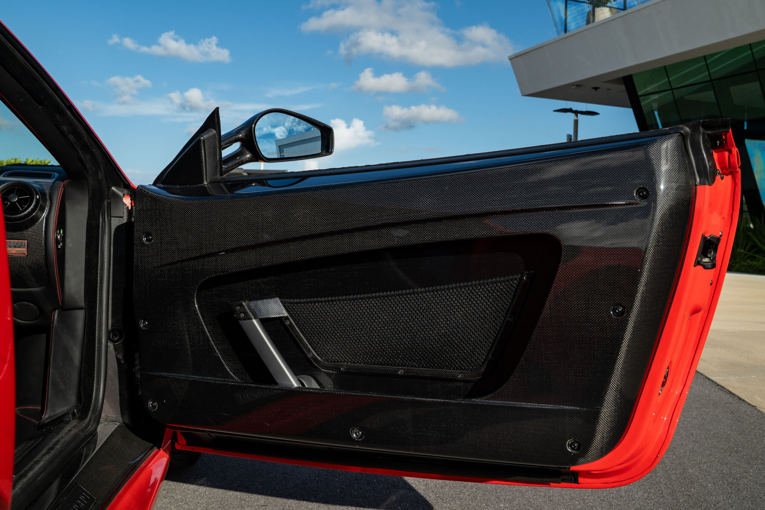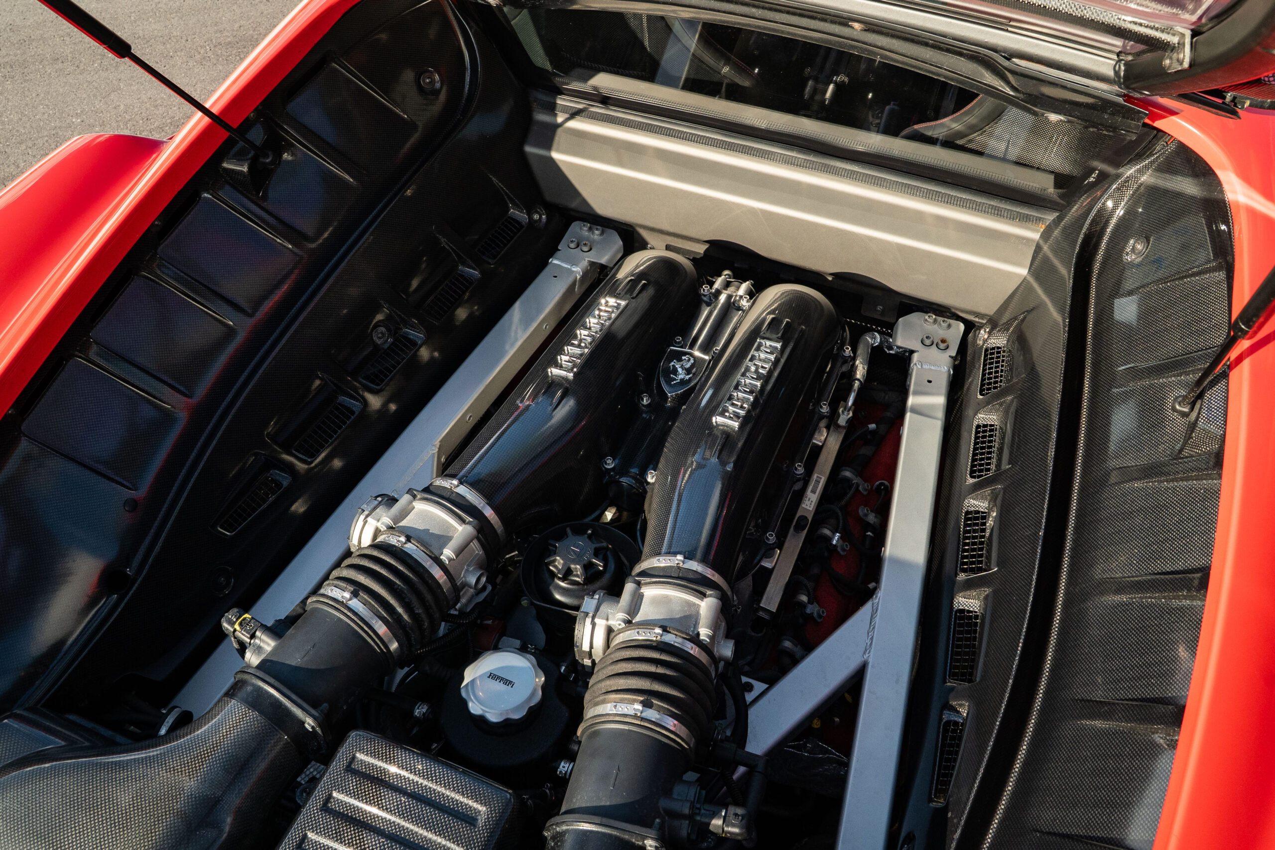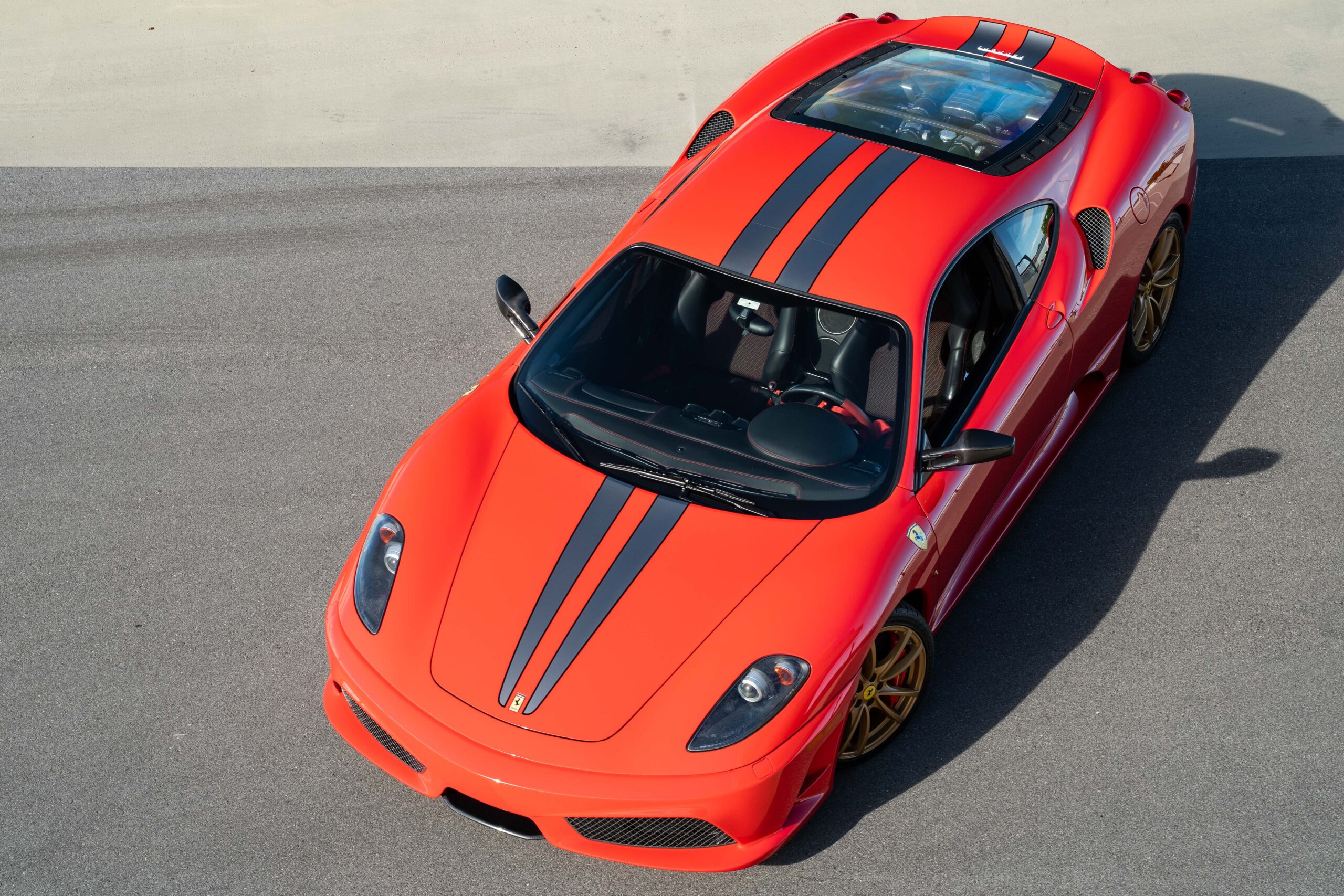 Finished in Rosso Scuderia over Black interior with silver stripes, factory red steering wheel, full leather upholstery, color matching calipers, and factory gold wheels, this is the quinessential Scuderia spec.