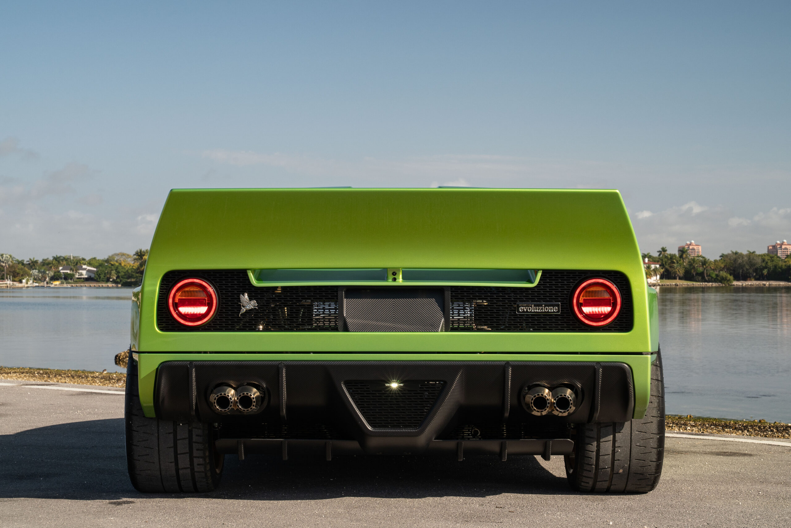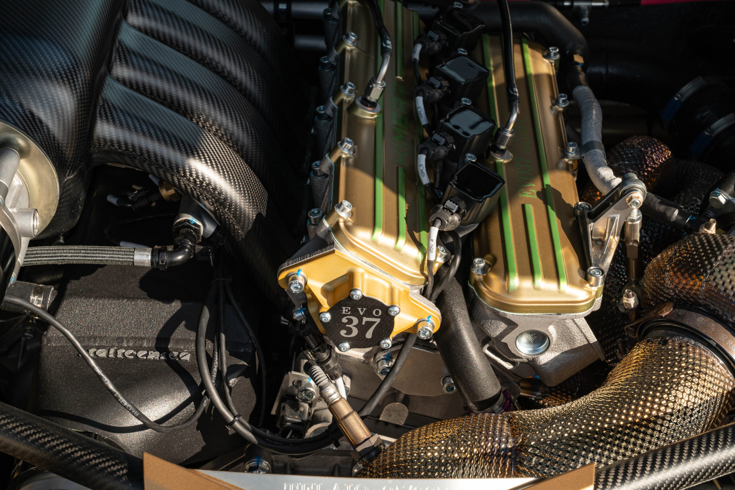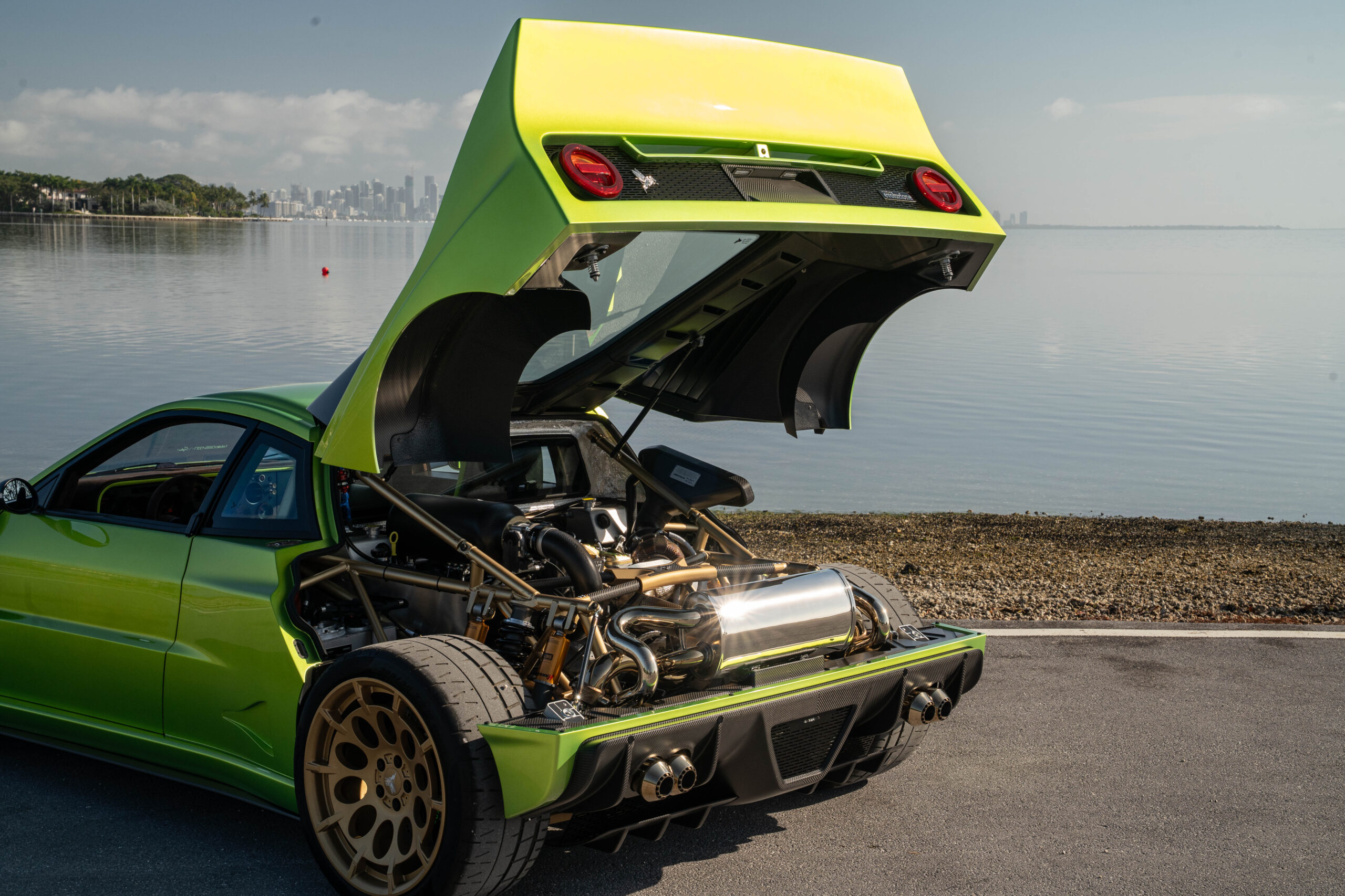 This example, named Sofia, is car number 25 of the 37 built for the world. Finished in Verde Citrica with all accents and tubular chassis done in Prismatic Gold, this unique configuration is equipped with the optional pod lighting, matte carbon trimmings all around the vehicle, carbon fan blades, Gold engine covers, full interior in Brown Alcantara with Acid Green deviations in stitching and leather, Martini harnesses, and fire extinguisher.